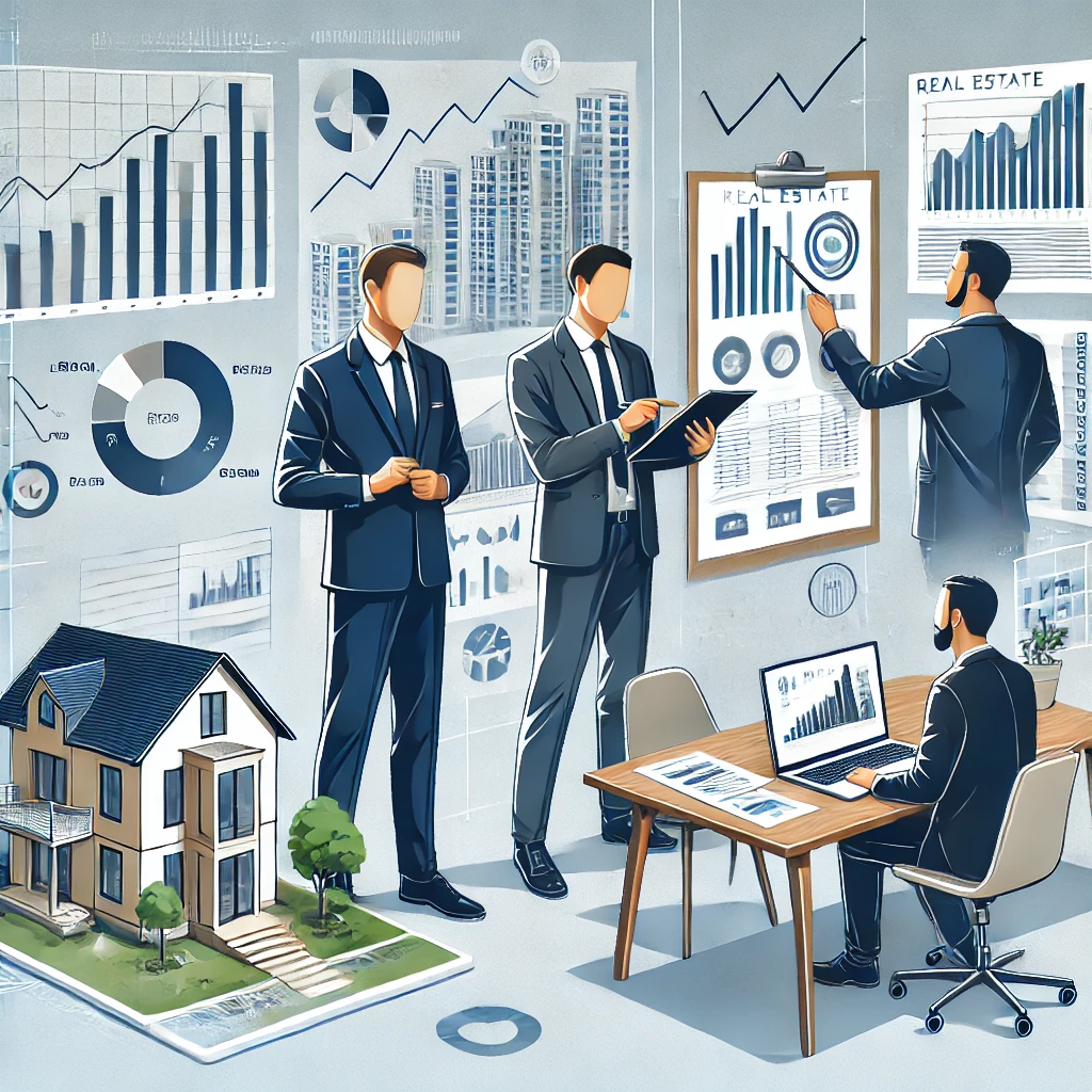 不動産投資家が物件データを分析し、建築家と相談している様子と、ブローカーがクライアントに契約書を提示しているシーン。デスクには不動産モデルや財務グラフ、タブレットが置かれ、ビジネスライクな雰囲気が漂う。