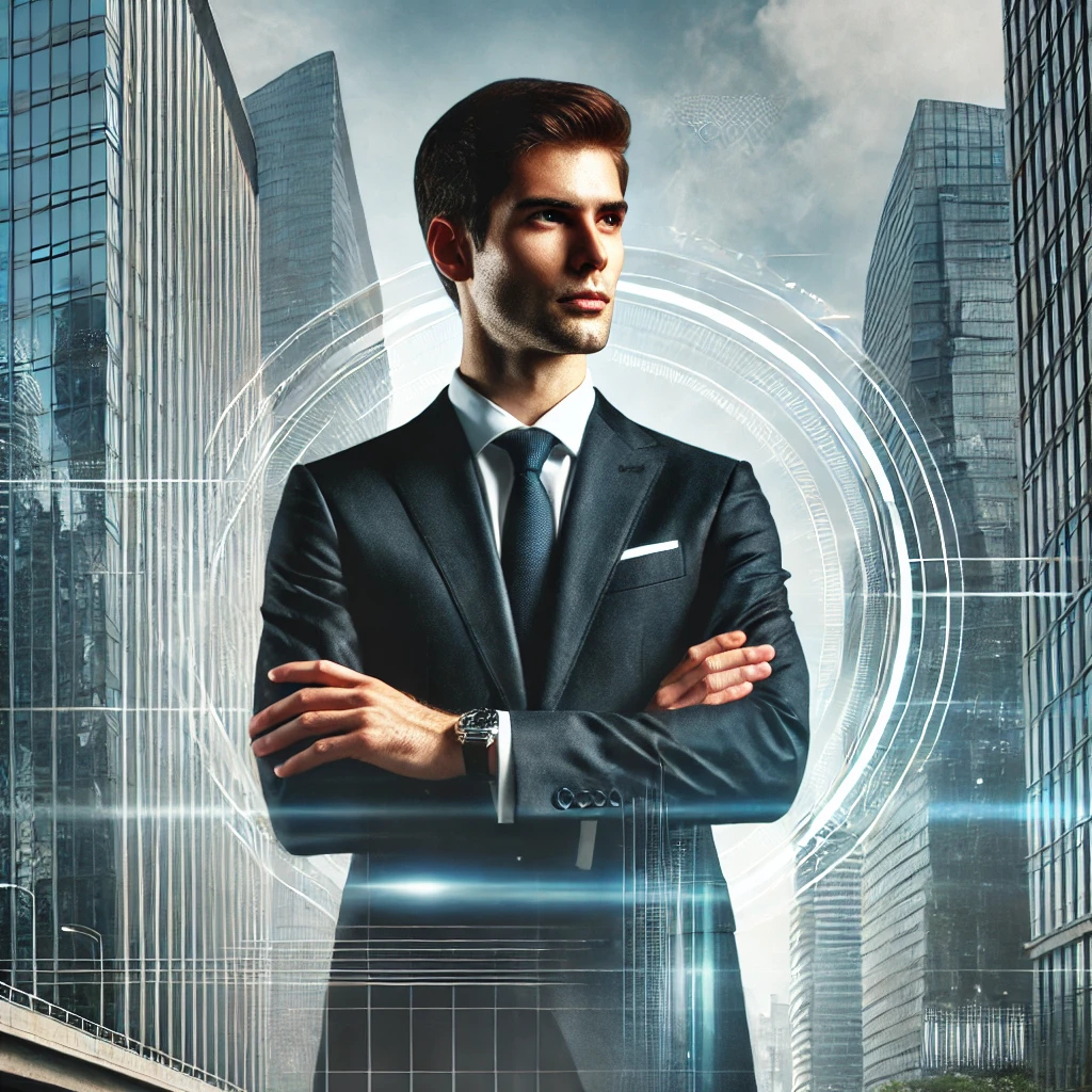 スーツを着たビジネスエグゼクティブがモダンなオフィスビルの前で自信を持って立つ姿。未来志向の経営戦略とリーダーシップを象徴するイメージ。