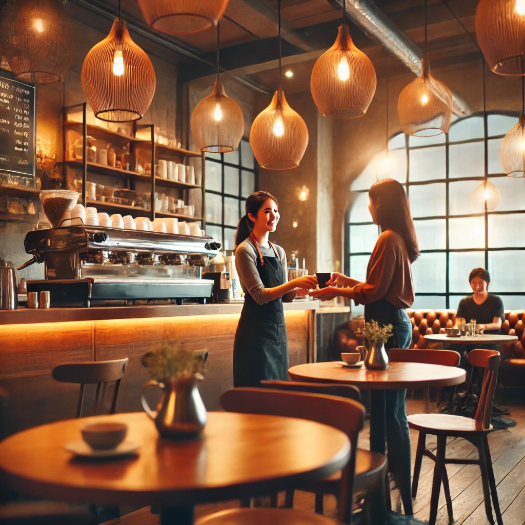 温かい照明と木製テーブルが特徴のカフェの店内。笑顔のバリスタがコーヒーを提供し、くつろげる雰囲気を演出している。