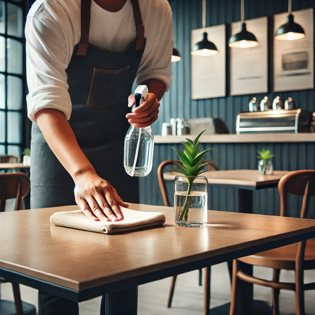 カフェの魅力は、おいしい飲み物や食べ物だけでなく、店内空間の清潔感や居心地の良さにも大きく左右されます。テーブルや椅子、カウンター、ショーケースなど、目に見える部分はもちろん、ドアノブやトイレ、ゴミ箱付近などの細部も丁寧に掃除することが欠かせません。また、テーブルの上にコーヒーのしずくや食べかすなどが残っていると、お客様はそこに座りたいとは思わなくなります。お客様が入店される前はもちろんのこと、営業中も定期的に店内を見回して、常に清掃を意識しましょう。